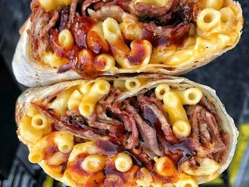 Mouth Watering Brisket , Pulled Pork or Smoked Chopped Chicken , Mac N Cheese , Sweet N Tangy Slaw , Bama Beans and BBQ Sauce Wrapped and Griddle In A Large Tortilla.